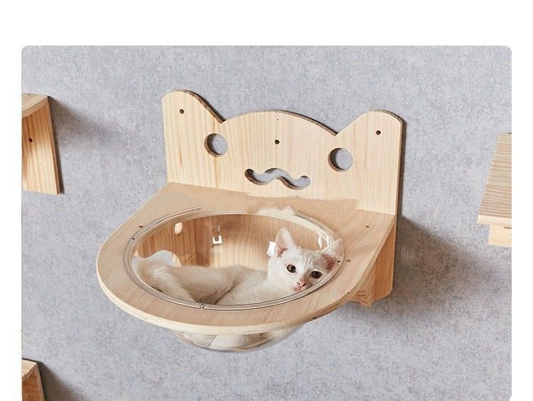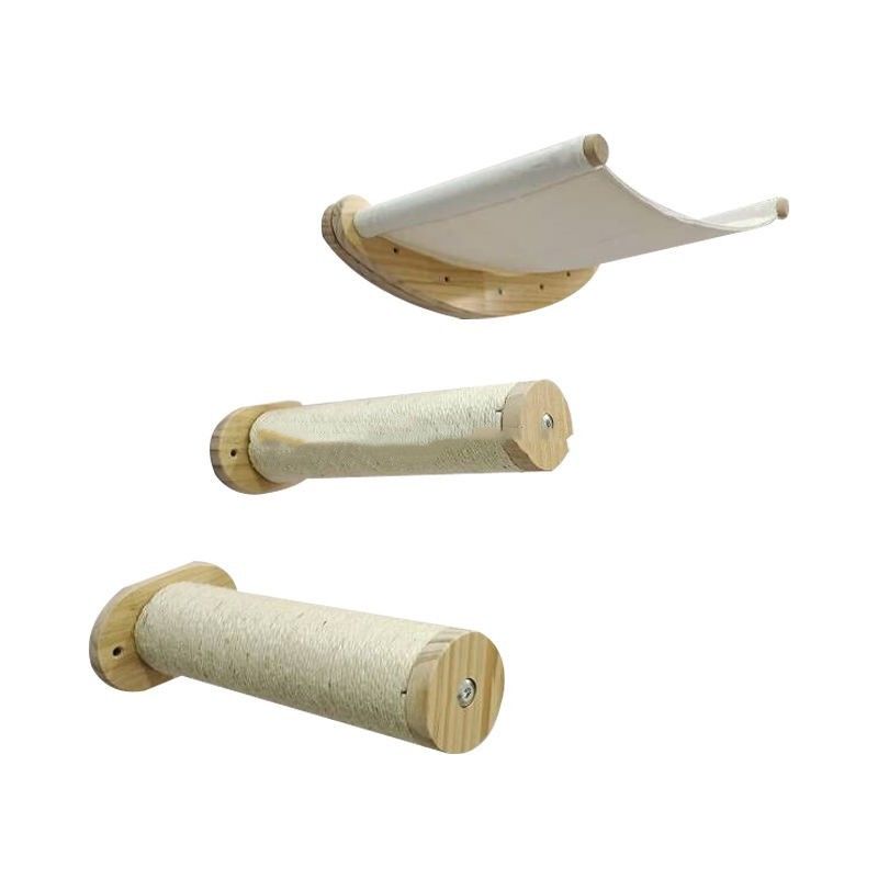 Konstrukcja hamaka: Montowane na ścianie kombinacje do wspinania się dla kotów mogą być wyposażone w konstrukcje hamaków, aby zapewnić wygodne i prywatne miejsce do odpoczynku.Hamaki mają zwykle miękkie materace, które zapewniają kotom ciepłe i wygodne warunki do spania.