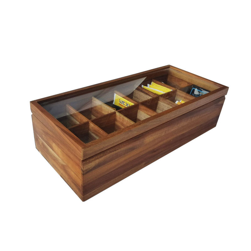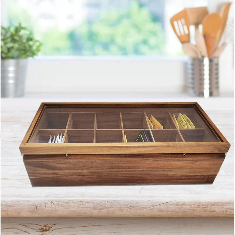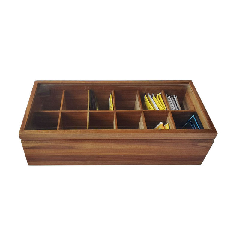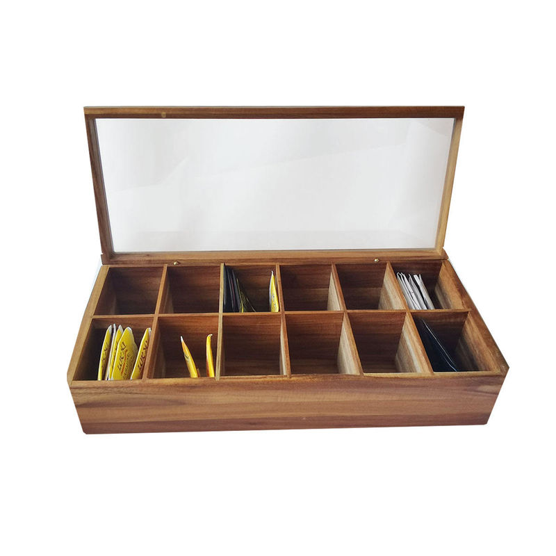 Regulowana płaska skrzynia 12 przegródek Złożony solidny drewniany organizer Torebka na herbatę Box Organizer ze szklaną pokrywką